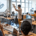 Two math t-shirts and a female is wearing an Algebra 1 t-shirt surrounded with math formulas